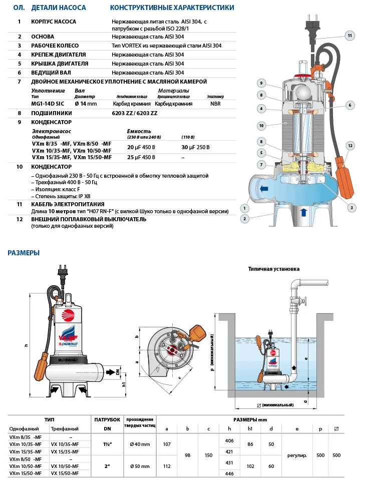 - Фекальный насос Pedrollo VXm 15/35-MF 10м